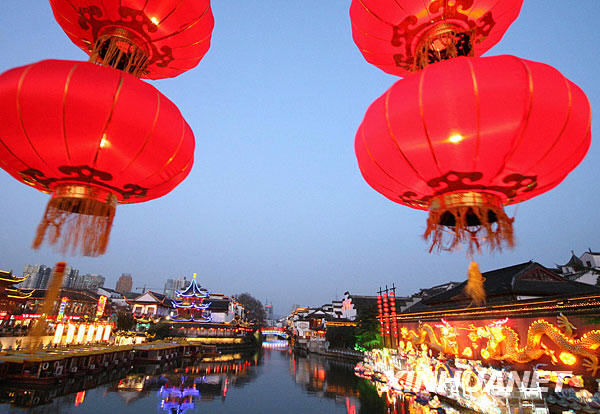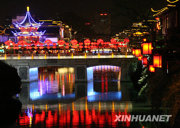 1月23日晚,南京夫子廟文德橋附近燈光璀璨,流光溢彩。 當日,2009年中國南京夫子廟——秦淮河風光帶國際燈會亮燈。本屆燈會從1月26日正式開始。屆時,50組大中型燈組、40萬盞手工扎制的花燈將把夫子廟景區裝點成燈的世界、花的海洋。新華社發(李文寶 攝)