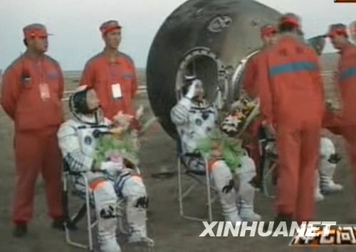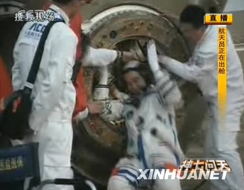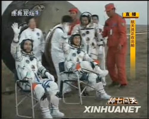 9月28日,神七返回艙艙門打開。航天員出艙。新華社發(fā)(電視截圖)