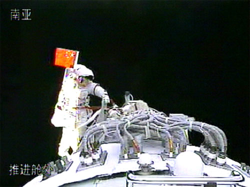 翟志剛對(duì)著攝像機(jī)揮舞國(guó)旗