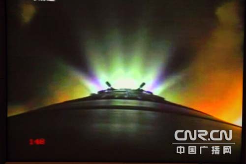 搭載著神舟七號載人飛船的長征二號F遙七運載火箭尾部噴出瑰麗的火焰(記者南光 曹囡囡 攝)