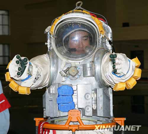 9月27日,中國人首次進行太空行走,翟志剛被確定為出艙航天員。這是翟志剛活動水下訓練服關節(資料照片)。新華社發(秦憲安攝)