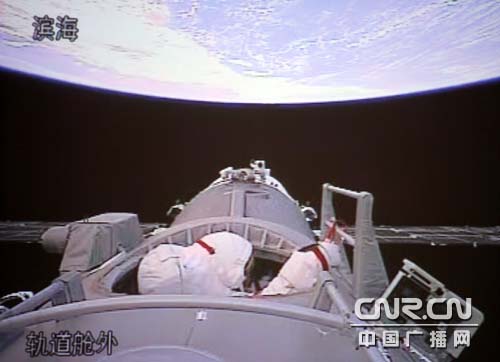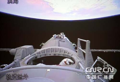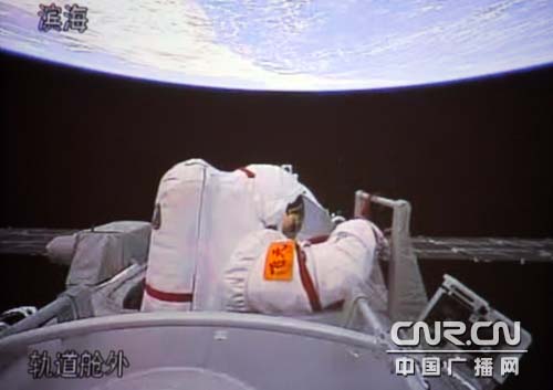 航天員翟志剛正在出艙。(中廣網記者南光 曹囡囡攝)