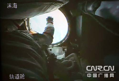 2008年9月27日16時39分,中國航天員翟志剛打開軌道艙門,即將出艙。(中廣網記者南光 曹囡囡攝)