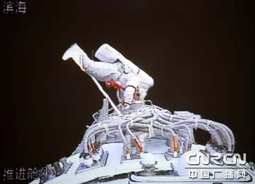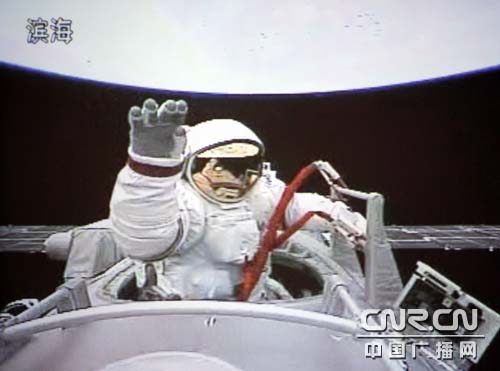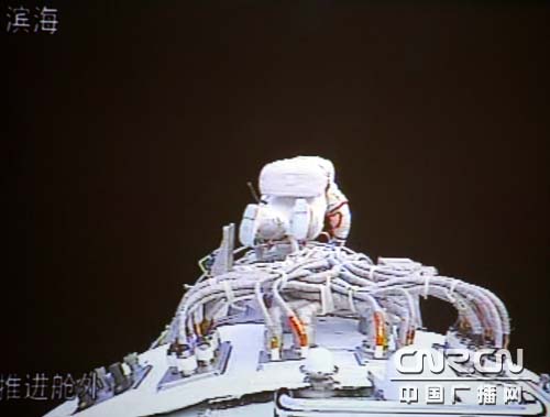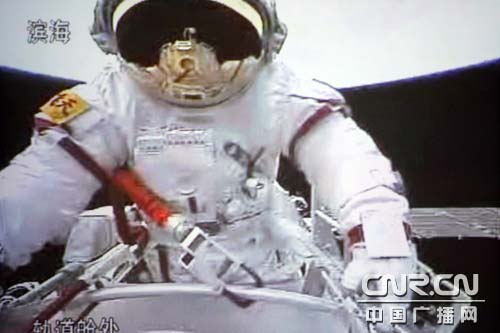 航天員翟志剛順利出艙。(中廣網記者南光 曹囡囡攝)