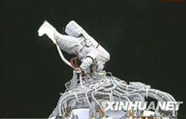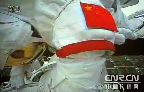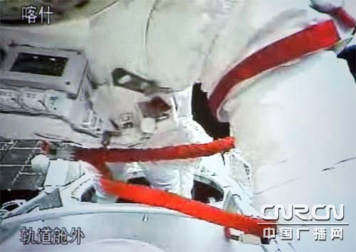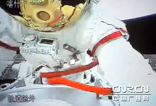 航天員翟志剛正在返回軌道艙,似乎有些依依不舍。(中廣網記者南光 曹囡囡攝)