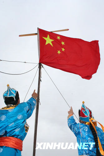 9月27日,居住在神七著陸區(qū)的牧民巴特爾(左)和托婭在草原上升起國旗,期盼飛船安全著陸。