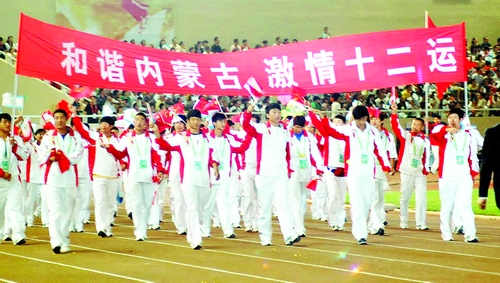 當日,內蒙古自治區第十二屆運動會在烏海市隆重開幕。本屆運動會共有來自全區各地的3340名運動員參賽,比賽設有25個大項422個小項,將產生487枚金牌、457枚銀牌和457枚銅牌。賽會將于8月23日閉幕。(康文魁攝)