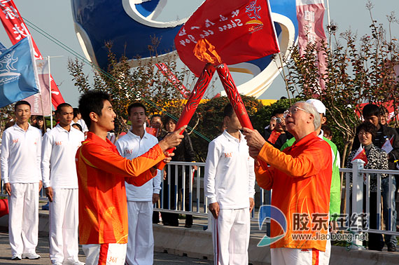邢傲偉將亞運(yùn)圣火傳遞給第二棒選手著名作曲家呂遠(yuǎn)