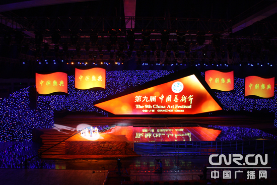 5月9日晚,第九屆中國藝術節開幕晚會“中國盛典”在廣州市體育館進行了首次帶妝聯排。圖為彩排現場。(中廣網記者時晨 攝)