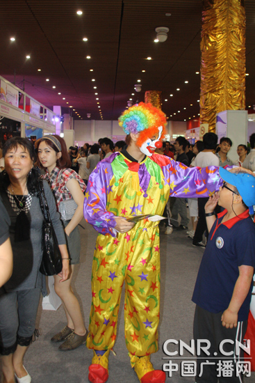 圖為“演交會”上派發宣傳單的可愛小丑與小朋友交流。(中廣網記者時晨 攝)