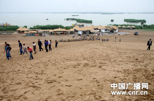 在沙沙聲中,登上沙湖分界線——二三十米高的沙漠脊梁。向兩邊張望,一邊是沙漠一邊是湖水。沙與水本是矛盾的兩端,相互充滿著張力。在這里沙與水卻相互映照、相互依偎,沙為水注入了硬度,水為沙增添了柔美,分不清誰是紅花、綠葉。造物主似乎也想做個媒人,帶了個南方湖泊來到北方,又捧了些精細的沙灑在湖的周圍。“北方硬漢”與“南方婉約女子”就這樣牽手。