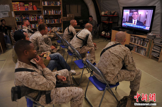 美國總統(tǒng)奧巴馬在當(dāng)?shù)貢r間5月1日發(fā)表全國電視演講,宣布“基地”組織領(lǐng)導(dǎo)人奧薩馬·本·拉登已被打死。圖為駐阿美軍某團士兵關(guān)注奧巴馬演講的電視新聞。