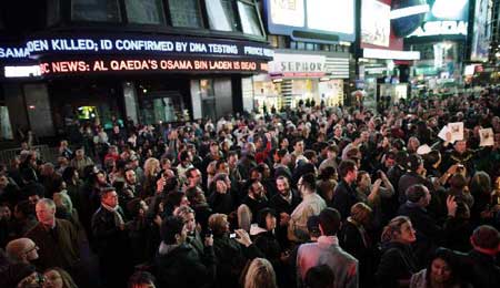 5月2日,人們在紐約時報廣場慶祝基地組織頭目本·拉丹被擊斃。