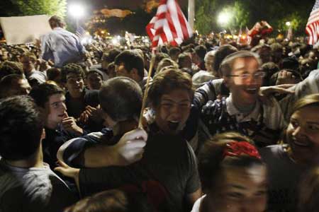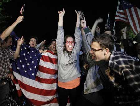 據美國媒體報道,美國總統奧巴馬宣布基地組織頭目本·拉丹被擊斃的消息后,美國許多民眾在5月2日凌晨自發舉行了慶祝活動。