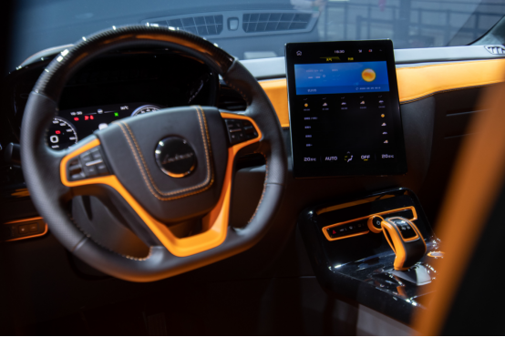 LEVC LX的內飾采用黑色與愛馬仕橙的雙色拼接設計,彰顯優雅奢華的品味,營造出高貴尊享的私人空間。LEVC LX擁有超大的個性定制客廂空間,長寬高尺寸達1740x1450x1435mm,并且與駕駛位之間設立可升降的隔離屏窗,營造完全獨立的私密空間。本次車展亮相的是四座行政版車型,據悉,LEVC LX后續還將推出三座旗艦版、七座豪華版,并且可以根據用戶個人喜好,對內飾進行超高自由度的定制化改裝。座椅材質選用頂級手工皮質,并集加熱、通風及按摩功能于一體。定制化星空穹頂配合超大的客廂空間營造出仿佛身在宇宙的夢幻乘坐感,行政酒廊則為用戶提供了更高階的奢華用車體驗。