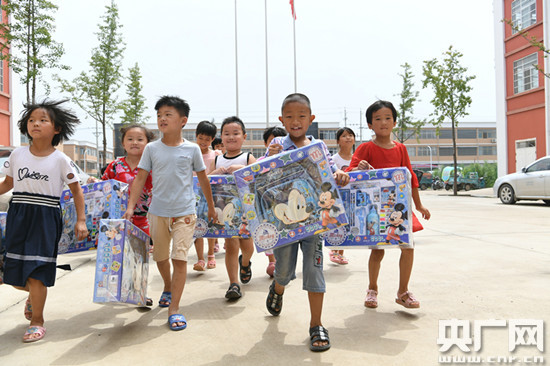 央廣網合肥8月4日消息(記者王利 通訊員桂運安 圖吳文兵)8月3日上午,安徽向日葵公益助學服務中心牽手阜陽市潁東區委區政府、京東集團華東分公司,赴潁東區新烏江鎮第二小學開展“扶貧助困關愛留守兒童”活動,為當地36名留守兒童送去了書包、圖書、文具、羽毛球拍等價值2萬元的愛心物資。