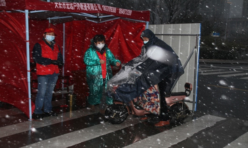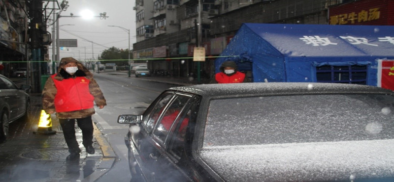 “昨天風大,先是雨,后是雪。我們設在一個小區卡口的帳篷一連倒了兩次。沒辦法,最后我們索性開來一輛面包車,車廂就是臨時檢查站,拉上一根繩就算是欄桿。再困難,任務也要完成,陣地不能丟。”想到15號一整天,自己的十多位同事風雪中堅守崗位的經歷,天長市人民檢察院辦公室副主任段彥菁依然十分感動。“天很冷,但是我們的心里是熱乎乎的。看到志愿者吃飯喝水有困難,有個小區居民帶著驅寒用的紅棗湯和茶葉蛋、方便面,下樓送到我們手中。丟下東西就走,直到現在,我們都不知道他的姓名。”
