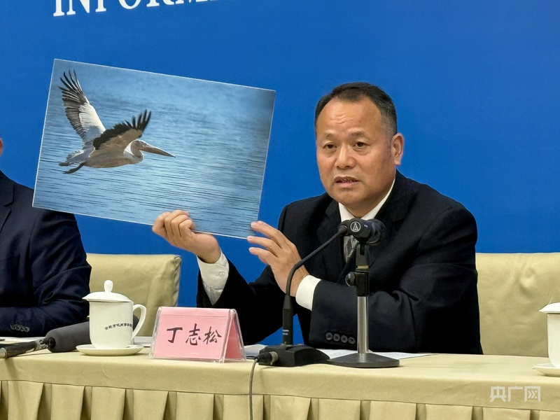 現場,合肥市生態環境局局長丁志松展示白鵜鶘在巢湖水域活動的圖片(央廣網記者 鮑玉嬋攝)