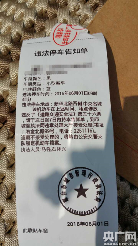 冀先生6月1日收到的違法停車告知單上,告知他違反了《道路交通安全法》第五十六條,他必須在7天內(nèi)拿著告知單,到當(dāng)?shù)爻枪軋?zhí)法局違章處理大廳接受處理,逾期不接受處理,將轉(zhuǎn)由公安交警支隊(duì)鎖定機(jī)動(dòng)車檔案。