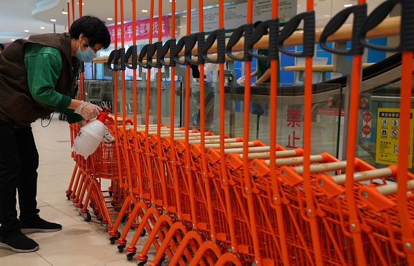 超市保潔員為兒童用購物車消毒(央廣網發 豐臺區委宣傳部供圖)