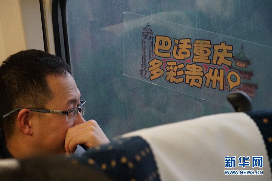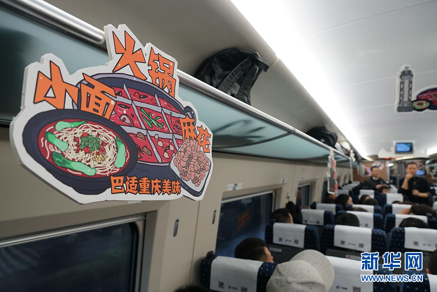 渝貴鐵路25日正式開通,重慶始發的D8581次實現2小時直達貴陽。圖為以重慶、貴州兩地特色元素裝扮的主題車廂。新華網 張免 攝 -