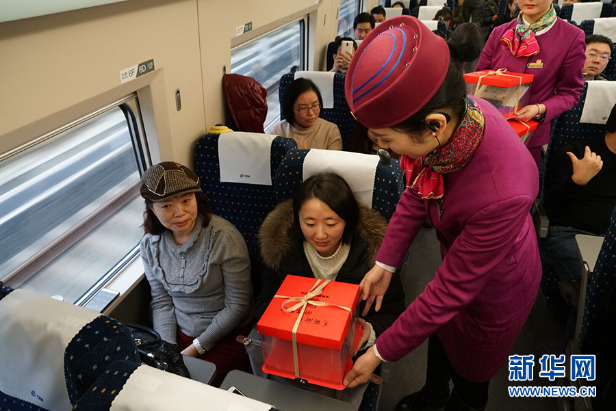 渝貴鐵路25日正式開通,重慶始發的D8581次實現2小時直達貴陽。圖為乘務人員為首趟動車乘客送上渝貴鐵路主題禮包。新華網 張免 攝 -
