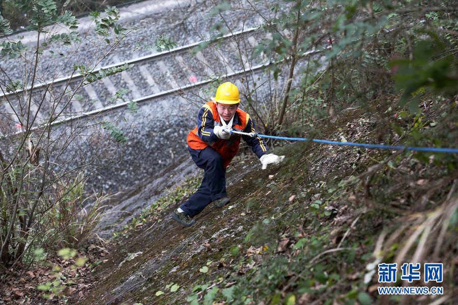 2月7日,在重慶市黔江區細塘灣山,中國鐵路成都局集團公司涪陵工務段黔江危石整治工區工長彭錦(前)在搜山排危。新華網發(楊敏 攝) -