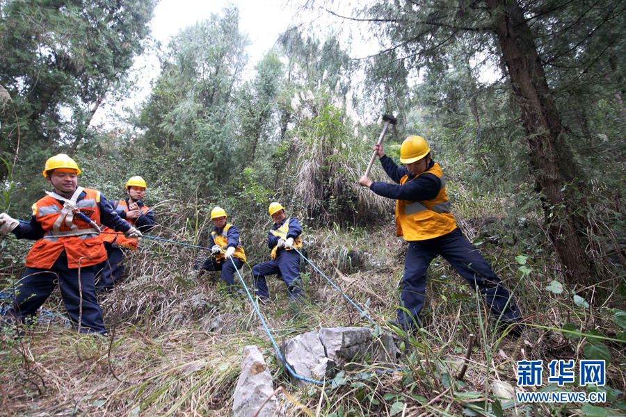 2月7日,在重慶市黔江區細塘灣山,中國鐵路成都局集團公司涪陵工務段黔江危石整治工區工人在搜山排危。新華網發(楊敏 攝) -