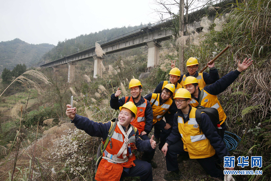 2月7日,在重慶市黔江區細塘灣山,中國鐵路成都局集團公司涪陵工務段黔江危石整治工區工人們在收工后合影。新華網發(楊敏 攝)