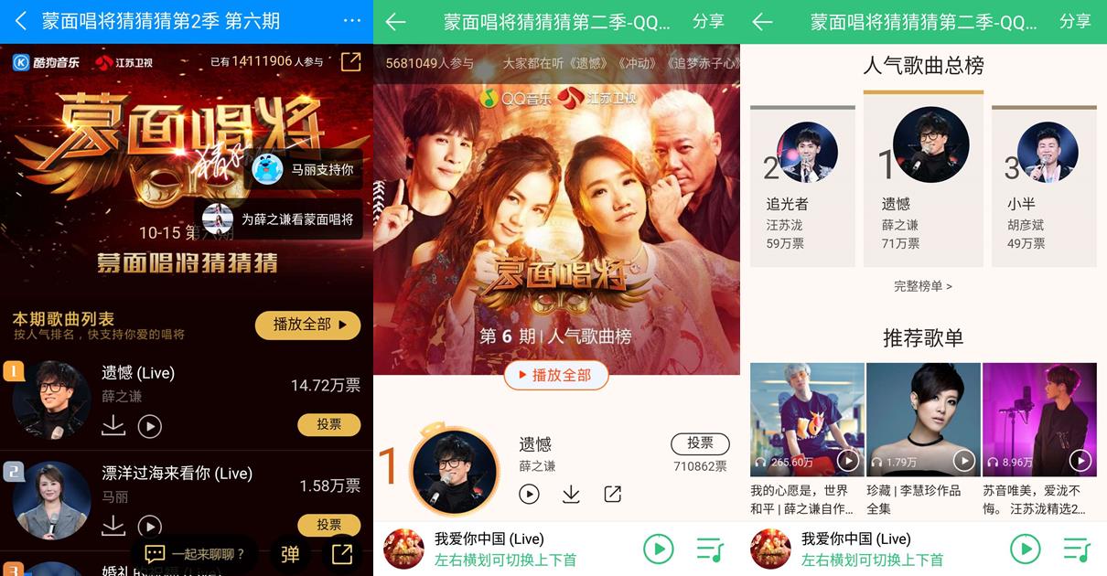 在當晚的節目中,率先征戰的“風中凌亂的小公舉”頭頂小風車,以一曲純凈通透的《漂洋過海來看你》感動全場,由于陶晶瑩的缺席,猜評團甚至一度認為就是陶子姐。不過憑借獨特的聲音特質,“來自東北的馬麗”還是在采訪環節被認出真“聲”,對于其“被喜劇掩蓋的音樂天賦”,QQ音樂網友也表示驚艷。而另一位新晉登臺的“刺”也遭聲線“出賣”,一張口就被認出是薛之謙本人,一曲《遺憾》唱盡悲歡離合,不僅與馬麗雙雙登上酷狗音樂蒙面唱將猜猜猜的人氣榜前兩位,更以68萬票“空降”QQ音樂當期人氣歌曲榜和人氣歌曲總榜冠軍,成為最強補位唱將。