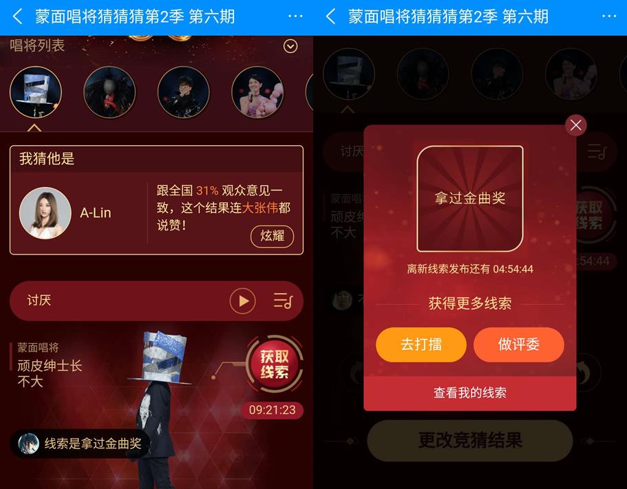 在繼第四期節目怒揭5面之后,周日剛剛落下帷幕的《蒙面唱將猜猜猜》第二季第六期節目再度“連中五員”。通過零時差高品質純享音頻和新鮮有趣的互動和獨家線索,節目獨家音頻合作方騰訊音樂娛樂集團旗下QQ音樂、酷狗音樂、酷我音樂吸引了大批網友前來集思廣益,不僅一舉揭開了困擾大家兩周的“淘氣的粉紅女王”李慧珍的神秘面紗,“何必在乎我是誰”蘇慧倫、“人間極品小魔頭”劉維,新晉補位的“風中凌亂的小公舉”馬麗,“刺”薛之謙也都接連猜中。