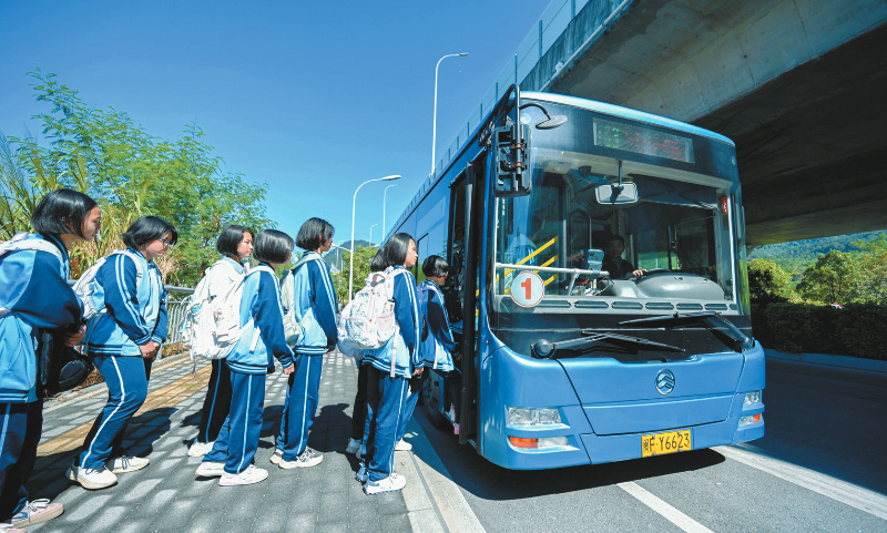 圖為鐵山中學(xué)學(xué)生乘坐定制公交專線。