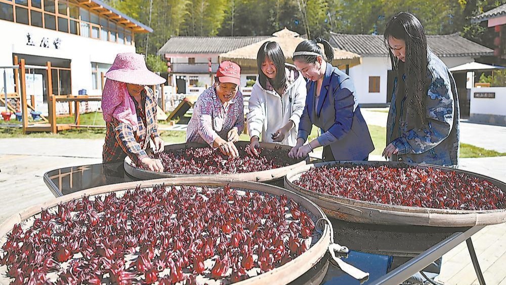10月29日,在寧化縣湖村鎮蛟湖文旅小鎮民宿前,村民在晾曬剛收的洛神花。