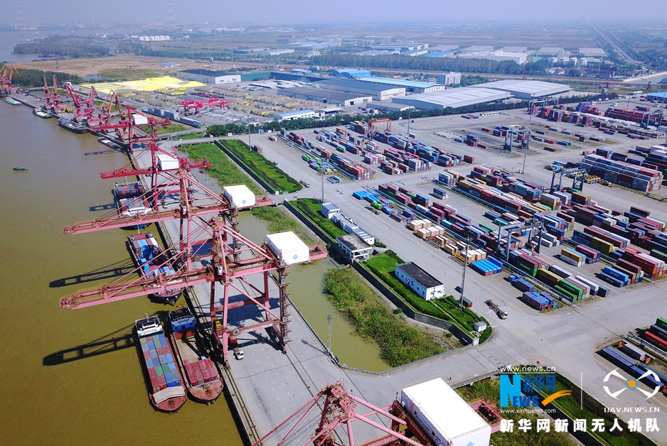 •   航拍長江上貨船往來,碼頭上集裝箱擺放有序,整箱待發,一派繁忙的景象。 (新華網 席航飛)
