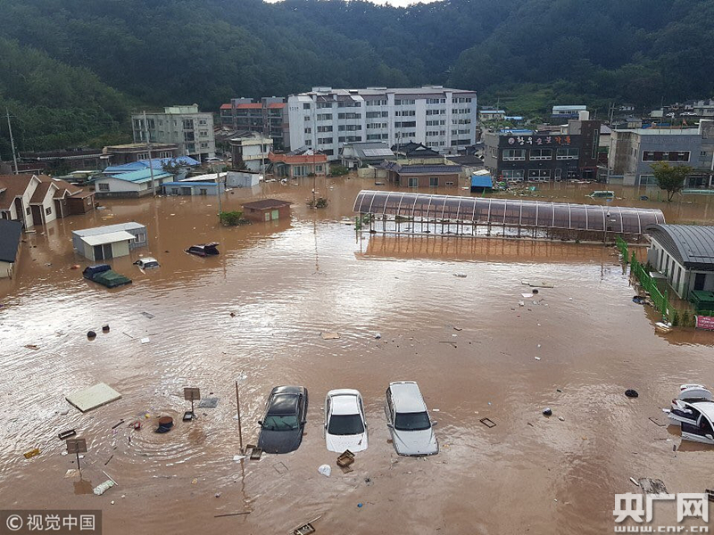 臺風“康妮”裹挾風雨登陸韓國 城市遭洪水淹沒