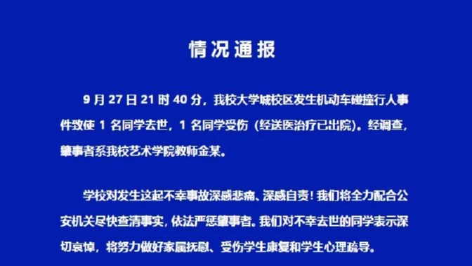 華南理工大學通報“校內發生車禍致1死1傷”:肇事者系學校教師,將全力配合公安機關盡快查清事實,依法嚴懲肇事者