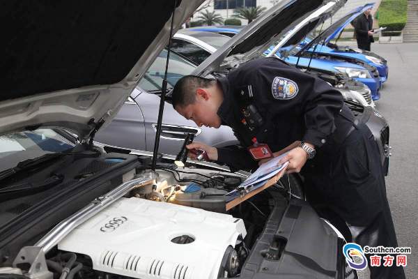 交警對改裝車進行檢查。