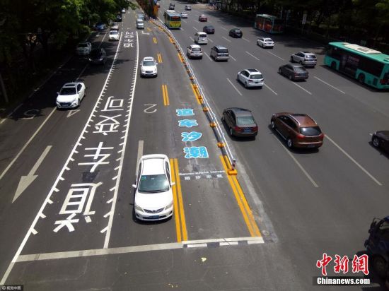 據(jù)中新網(wǎng)報(bào)道,4月17日,廣東深圳,全國(guó)首條應(yīng)用遙控移動(dòng)護(hù)欄燈控的潮汐車道亮相深圳市南山區(qū)深南南新路口。據(jù)介紹,遙控移動(dòng)護(hù)欄的學(xué)名為“馬路機(jī)器人”,“馬路機(jī)器人”的應(yīng)用讓潮汐車道和對(duì)向車道間有了物理隔離,這條潮汐車道也被形容為“會(huì)走路的潮汐車道”。鄒碧雄 攝 圖片來(lái)源:視覺(jué)中國(guó)