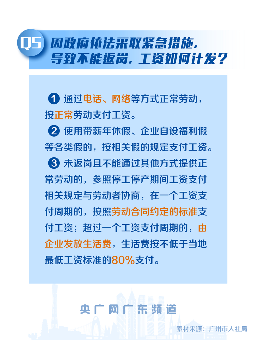 另外,受疫情影響不能返崗,勞動者的工資應如何計發?被依法隔離時,工資又該如何計發?日前,廣州市人力資源和社會保障局也給出了相關回應。