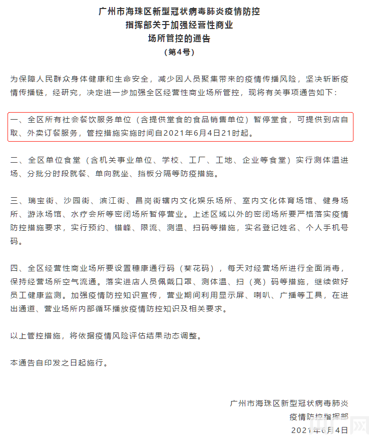 通告明確,海珠區全區所有社會餐飲服務單位(含提供堂食的食品銷售單位)暫停堂食,可提供到店自取、外賣訂餐服務,管控措施實施時間自2021年6月4日21時起。