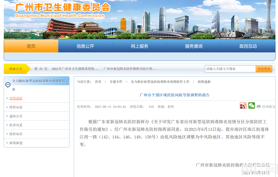 央廣網廣州6月13日消息(記者 張勝強)6月13日晚,記者從廣州市衛生健康委員會獲悉,根據廣東省新冠肺炎防控指揮辦《關于印發廣東省應對新型冠狀病毒肺炎疫情分區分級防控工作指引的通知》,經廣州市新冠肺炎防控指揮部同意,自2021年6月13日起,廣州市南沙區珠江街道珠江西一路(142、144、146、148、150號)由低風險地區調整為中風險地區。其他地區風險等級不變。