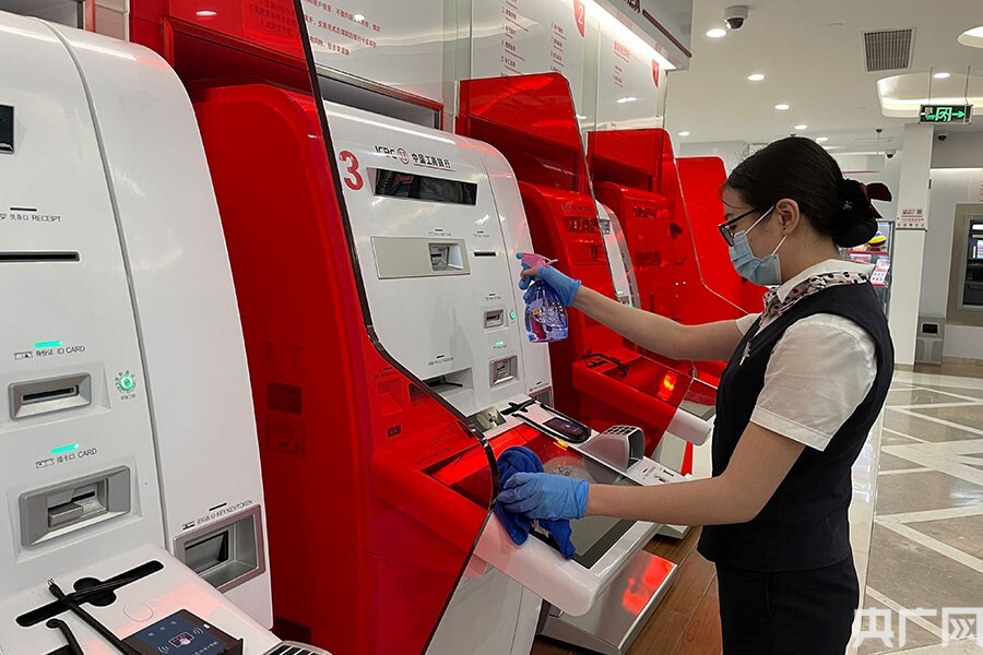 工商銀行廣州分行某網(wǎng)點(diǎn),工作人員正在消毒營業(yè)廳設(shè)備。(央廣網(wǎng)發(fā) 通訊員供圖)