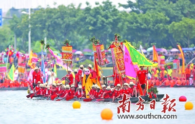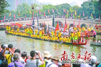 據南方網報道,28日,番禺在市橋河舉辦番禺區第十六屆龍舟賽暨彩龍競艷活動。活動中,各代表隊別出心裁,呈現特色的龍船裝飾,引來觀眾陣陣喝彩。南方網全媒體記者 羅斌豪 攝