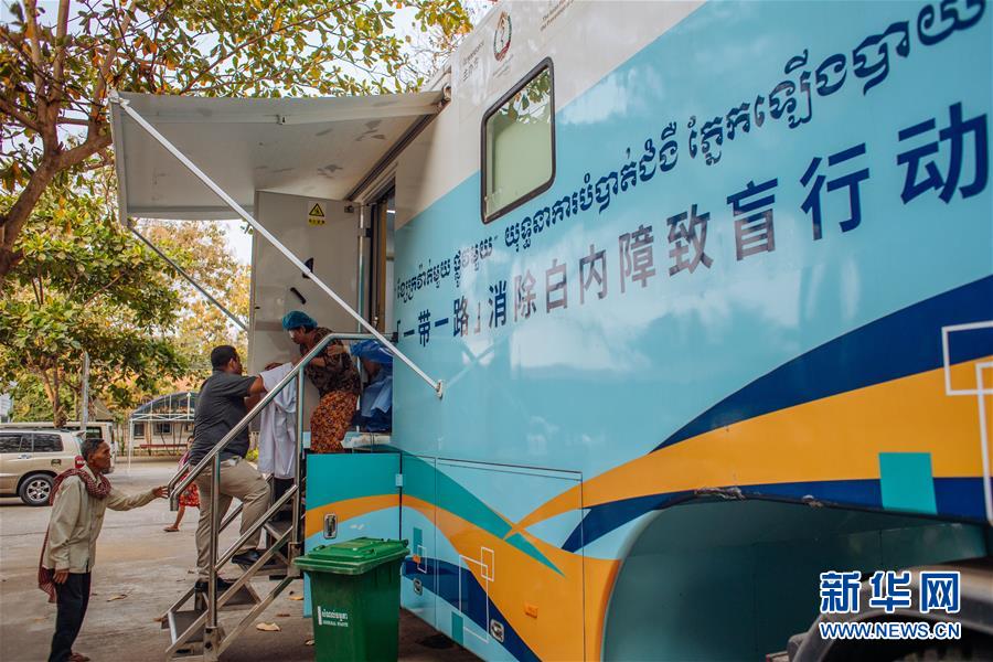 3月15日,在柬埔寨磅湛省醫(yī)院,洪清(左二)幫助一名剛做完白內(nèi)障手術(shù)的病人走下醫(yī)療車(chē)。