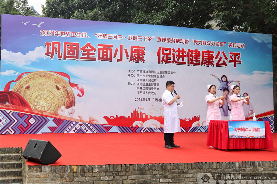 廣西新聞網南寧4月7日訊(記者 黎伊瑋)今年4月7日是第72個世界衛生日,我國的宣傳主題為“鞏固全面小康,促進健康公平”。為了推動全區廣大人民群眾對衛生健康的重視,不斷提高全區各族人民的健康水平,2021年世界衛生日、“壯族三月三·衛健三下鄉”宣傳服務活動暨“我為群眾辦實事”實踐活動在南寧市江西鎮揚美古鎮金馬街廣場舉行。此次活動由自治區衛生健康委員會主辦,南寧市衛生健康委員會、江南區人民政府承辦,江南區衛生健康局、中共江西鎮委員會、江西鎮人民政府協辦。