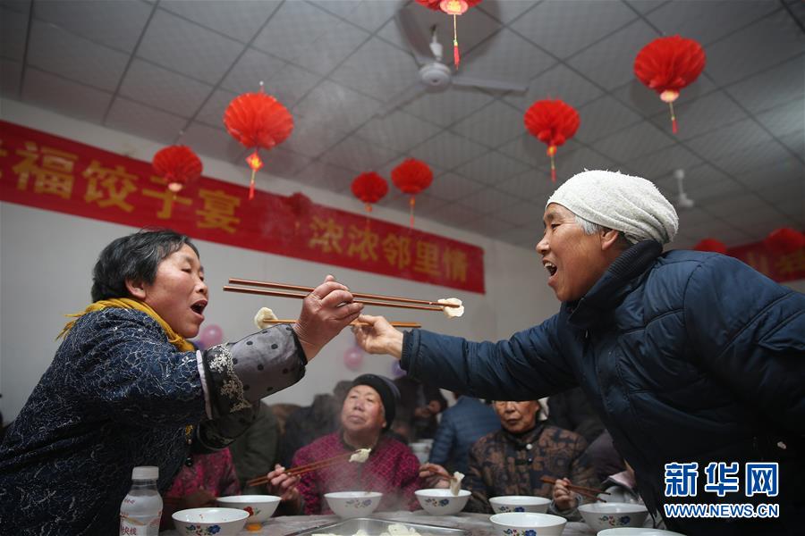 2月21日,在河北石家莊平山縣卷掌村活動(dòng)中心,村民們用長筷子互相喂食餃子。當(dāng)日,河北省石家莊市平山縣卷掌村舉行“幸福餃子宴”活動(dòng),餃子宴上的筷子長達(dá)42厘米,人們只有互相喂食才能方便地吃到餃子,百余名村民在互助互愛中分享快樂。新華社發(fā)(王偉倩 攝) -