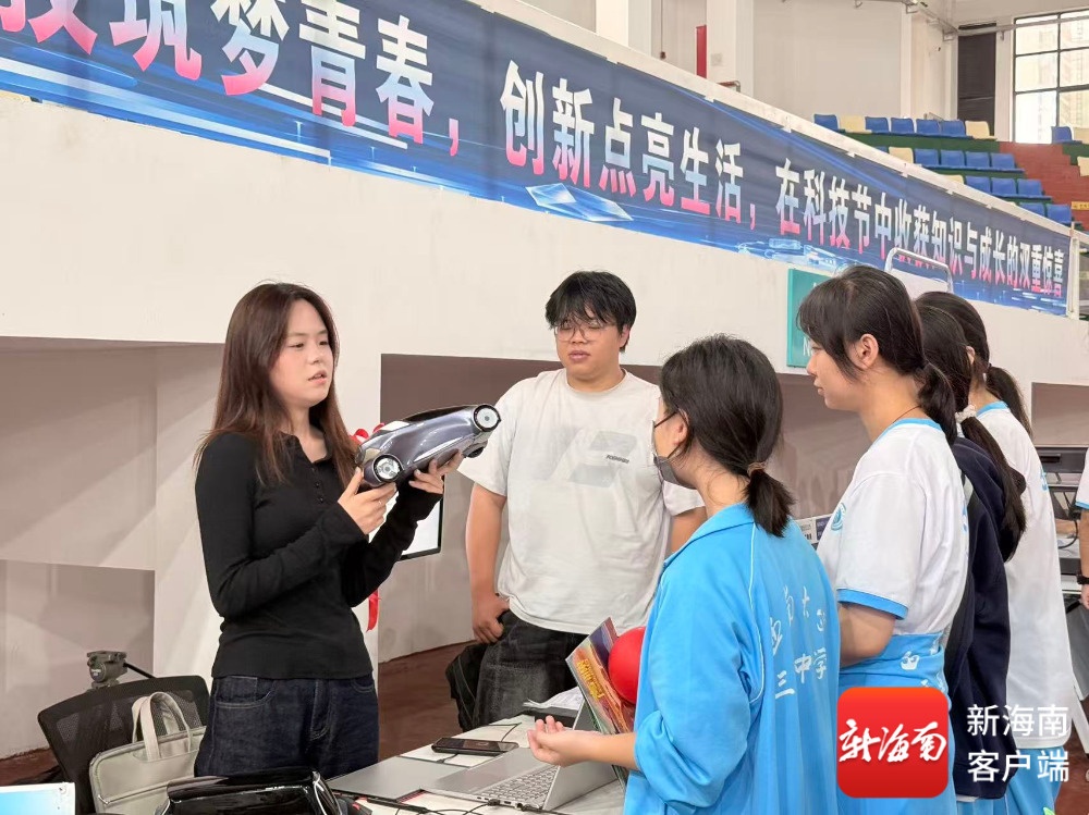 三亞學院學子向西南大學三亞中學學生分享汽車設計構思。胡麗齊 攝
