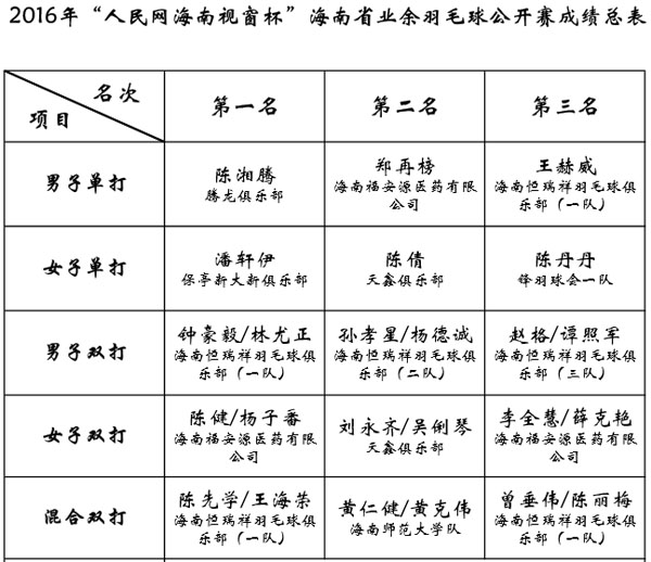 人民網(wǎng)海南頻道海口12月18日電 12月18日下午,經(jīng)過兩天的激烈比賽,2016“人民網(wǎng)海南視窗杯”海南省業(yè)余羽毛球公開賽在?陉柟饣@球羽毛球體育館圓滿落幕。最終,騰龍俱樂部陳湘騰、保亭新大新俱樂部潘軒伊、海南恒瑞祥羽毛球俱樂部(一隊)鐘豪毅/林尤正、海南福安源醫(yī)藥有限公司陳健/楊子番、海南恒瑞祥羽毛球俱樂部(一隊)陳先學(xué)/王海榮分獲男子單打、女子單打、男子雙打、女子雙打、混合雙打冠軍。