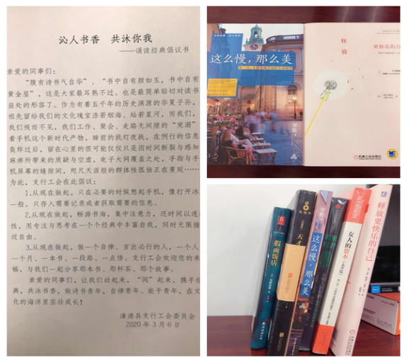 新冠肆虐,支行的女職工們卻把每一天的堅守崗位都當成奮斗的舞臺,唯有注重勞逸結合才能更好地發揮自身的作用。為了讓女職工們在業余時間內做些能愉悅自己、放松心情的娛樂消遣,支行組織大家進行好書推薦活動,并發出誦讀經典倡議書。大家結合工作及思想實際推薦了《安妮日記》《青鳥》等佳作,執筆撰寫了自己的閱讀感悟,暢所欲言,在書香中來了一場心靈的碰撞。大家紛紛表示,此項活動讓她們獲得充足的精神食糧,在結束每天忙碌的工作后,片刻的閱讀讓身心得以舒展,足以在第二天以更飽滿的狀態投入到工作中,以力所能及的方式為戰勝疫情、促進發展作出更大的貢獻。