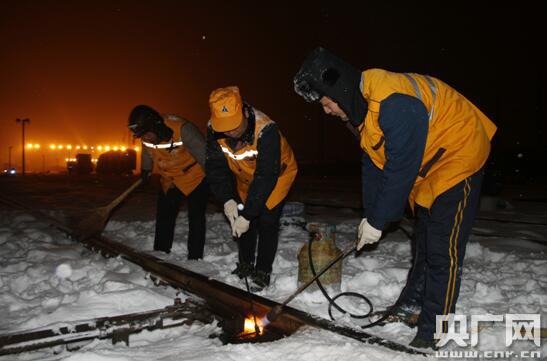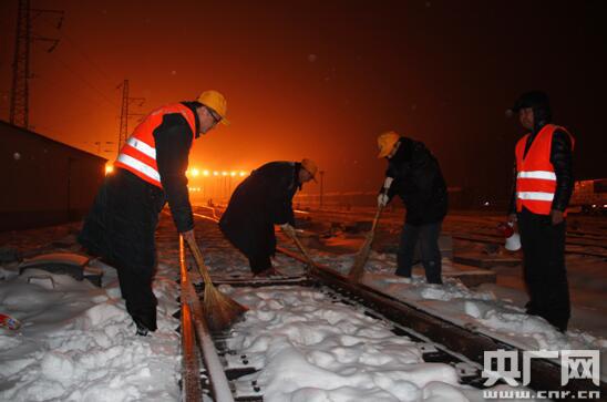央廣網河南分網1月9日消息 近期受強冷空氣影響,豫南地區連降兩場大雪,室外溫度也低至零下10度,為確保惡劣天氣下運輸暢通,武漢鐵路局漯河火車站以雪為令,組建打冰除雪突擊隊晝夜堅守一線,不間斷地對站區道岔、廣場、站臺等關鍵處所進行清掃、涂抹防凍液。